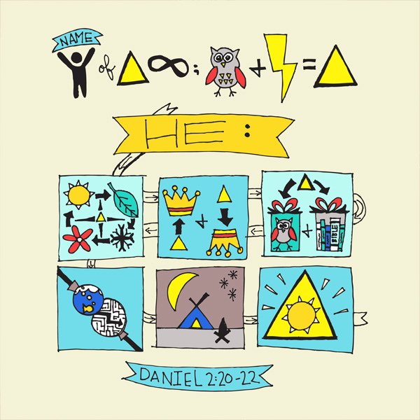 Craziness, right!!? Today’s verse is supposed to be a visual-memory-jogger…something that can help you remember these verses. How it works: work on memorizing Daniel 2:20-22. After you are feeling fairly comfortable…use this illustration to run through the verses. Let the images help you remember the words of the verses!